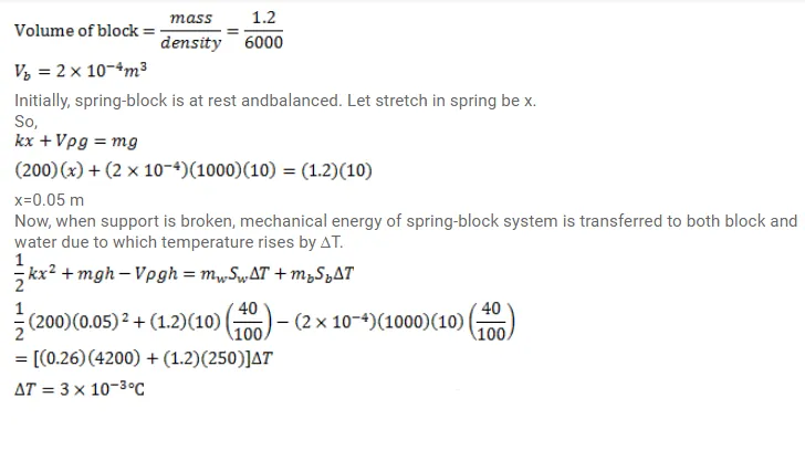 A metal block of density $6000 \mathrm{~kg} / \mathrm{m}^{3}$ and mass $1.2 \mathrm{~kg}$ is suspended through a spring of spring constant $200 \mathrm{~N} / \mathrm{m}$. The spring-block system is dipped in water kept in a vessel. The water has a mass of $260 \mathrm{~g}$ and the block is at a height $40 \mathrm{~cm}$ above the bottom of the vessel. If the support to the spring is broken, what will be the rise in the temperature of the water. Specific heat capacity of the block is $250 \mathrm{~J} / \mathrm{kg}-\mathrm{K}$ and that of water is $4200 \mathrm{~J} / \mathrm{kg}-\mathrm{K}$. Heat capacities of the vessel and the spring is negligible.