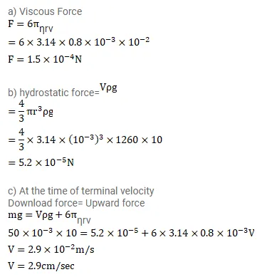 (c) the terminal velocity with which the sphere will moved down without acceleration. Density of glycerine = $1260 \mathrm{~kg} / \mathrm{m}^{3}$ and its coefficient viscosity at room temperature $=8.0$ poise.