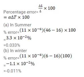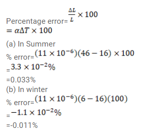 A meter scale is made up of steel and measures correct length at $16^{\circ} \mathrm{C}$. What will be the percentage error if this scale is used (a) on a summer day when the temperature is $46^{\circ} \mathrm{C}$ and (b) on a winter day when the temperature is $6^{\circ} C_{\text {? Coefficient of linear expansion of steel }=11} \times 10^{-6} /{ }^{\circ} \mathrm{C}$