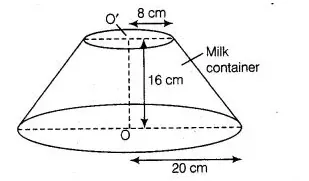 $\therefore$ Volume of the milk container made of metal sheet in the form of a frustum of a cone