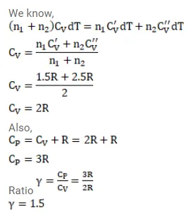 A mixture contains 1 mole of helium $\left(C_{p}=2.5 R, C_{v}=1.5 R\right)$ and 1 mole of hydrogen $\left(C_{p}=3.5 R, C v=2.5 R\right)$. Calculate the values of $C_{p}, C_{v}$ and $\gamma$ for the mixture.