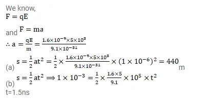 A molecule of a gas, filled in a discharge tube, gets ionized when an electron is detached from it. An electric field of $5.0 \mathrm{kV} / \mathrm{m}$ exists in the vincinity of the event. (a) Find the distance travelled by the free electron in $1 \mu_{\mathrm{S}}$ assuming no collision. (b) If the mean free path of the electron is $1.0 \mathrm{~mm}$, estimate the time of transit of the free electron between successive collisions.