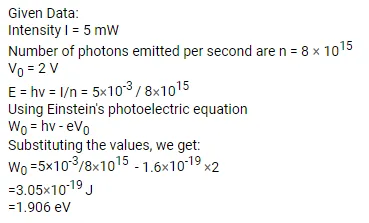 A monochromatic light source of intensity $5 \mathrm{~mW}$ emits $8 \times 10^{15}$ photons per second. This light ejects photoelectrons from a metal surface. The stopping potential for this setup is $2.0 \mathrm{~V}$. Calculate the work function of the metal.