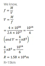 A neutron star has a density equal to that of a nuclear matter. Assuming the star to be spherical, find the radius of a neutron star whose mass $4.0 \times 10^{30} \mathrm{~kg}$ (twice the mass of the sun).