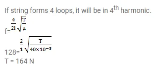A one meter long stretched string having a mass of $40 \mathrm{~g}$ is attached to a tuning fork. The fork vibrates 128 Hz in a direction perpendicular to the string. What should be the tension in the string if it is to vibrate in four loops?