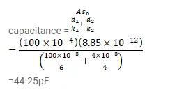 A parallel-plate capacitor has plate area $100 \mathrm{~cm}$-square and piate separation I.0 cm. A glass plate (dielectric constant $6.0$ ) of thickness $6.0 \mathrm{~mm}$ and an ebonite plate (dielectric constant 4.0) are inserted one over the other to fill the space between the plates of the capacitor. Find the new capacitance.