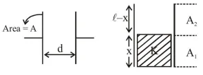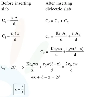 A parallel plate capacitor has plate of length ' $l$ ', width 'w' and separation of plates is 'd'. It is connected to a battery of emf V. A dielectric slab of the same thickness 'd' and of dielectric constant $\mathrm{k}=4$ is being inserted between the plates of the capacitor. At what length of the slab inside plates, will be energy stored in the capacitor be two times the initial energy stored?