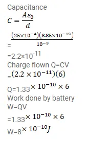 A parallel-plate capacitor having plate area $25 \mathrm{~cm}^{2}$ and separation $1.00 \mathrm{~mm}$ is connected to a battery of $6.0 \mathrm{~V}$. Calculate the charge flown through the battery. How much work has been done by the battery during the process?
