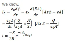 A parallel-plate capacitor having plate-area $\mathrm{A}$ and plate separation $\mathrm{d}$ is joined to a battery of emf $\epsilon$ and internal resistance $\mathrm{R}$ at $\mathrm{t}=0$. Consider a plane surface of area $\mathrm{A} / 2$, parallel to the plates and situated symmetrically between them. Find the displacement current through this surface as a function of time.