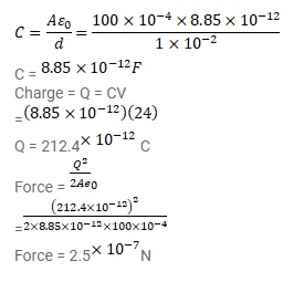 A parallel-plate capacitor with the plate area $100 \mathrm{~cm}^{2}$ and the separation between the plates $1.0 \mathrm{~cm}$ is connected across a battery of emf 24 volts. Find the force of attraction between the plates.