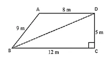 Given sides of a quadrilateral are AB = 9 m, BC = 12 m, CD = 5 m, DA = 8 m.