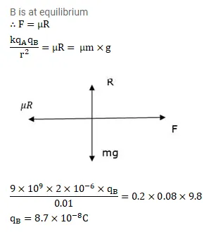 A particle A having a charge of $2.0^{\times 10^{-6}} \mathrm{C}$ is held fixed on a horizontal table. A second charged particle of mass $80 \mathrm{~g}$ stays in equilibrium on the table at a distance of $10 \mathrm{~cm}$ from the first charge. The coefficient of friction between the table and this second particle is ${ }^{\mu}=0.2$. Find the range within which the charge of this second particle may lie.