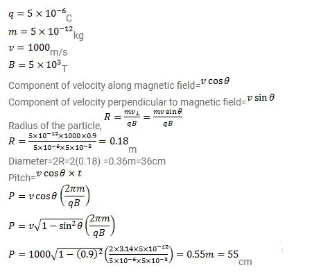 A particle having a charge of $5.0 \mu \mathrm{C}$ and a mass of $5.0 \times 10^{-12} \mathrm{~kg}$ is projected with a speed of $1.0 \mathrm{~km} / \mathrm{s}$ in a magnetic field of magnitude $5.0 \mathrm{mT}$. The angle between the magnetic field and the velocity is $\sin ^{-1}(0.90)$. Show that the path of the particle will be a helix. Find the diameter of the helix and its pitch.