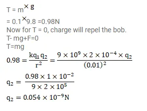 A particle having a charge of $\times 10^{-4} \mathrm{C}$ is placed directly below and at a separation of $10 \mathrm{~cm}$ from the bob of a simple pendulum at rest. The mass of the bob is $100 \mathrm{~g}$, what charge should the bob be given so that the string becomes loose.