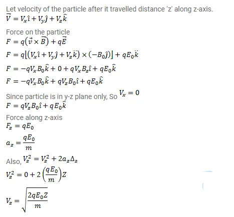 A particle having a mass $m$ and charge $q$ is released from the origin in a region in which electric field and magnetic field are given by $\vec{B}=-B_{0} \vec{j}$ and $\vec{E}=E_{0} \vec{k}$. Find the speed of the particle as a function of its z-coordinate.