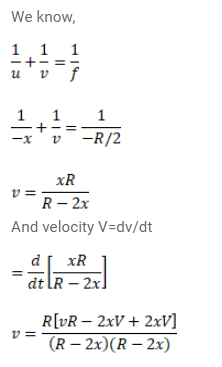 A particle is moving at a constant speed $\mathrm{V}$ from a large distance towards a concave mirror of radius $\mathrm{R}$ along its principal axis. Find the speed of the image formed by the mirror as a function of the distance $x$ of the particle from the mirror.