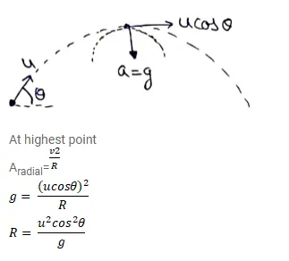 A particle is projected with a speed $\mathrm{u}$ at an angle 0 with the horizontal. Consider a small part of its path near the highest position and take it approximately to be a circular arc. What is the radius of this circle? This radius is called the radius of curvature of the curve at the point.