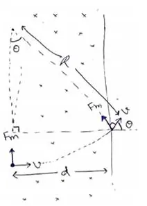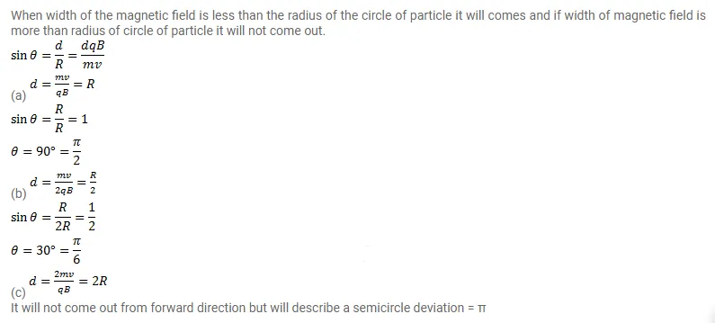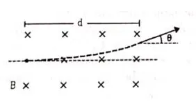 A particle of mass $m$ and charge $q$ is projected into a region having a perpendicular magnetic field $B$. Find the angle of deviation of the particle as it comes out of the magnetic field if the width d of the region is very slightly smaller than