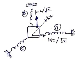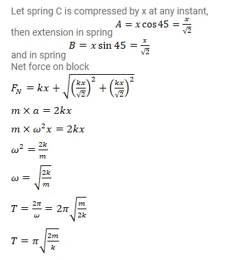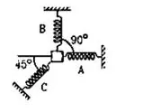 A particle of mass $\mathrm{m}$ is attached to three springs $\mathrm{A}, \mathrm{B}$ and $\mathrm{C}$ of equal force constants $\mathrm{k}$ as shown in figure. If the particle is pushed slightly against the spring $C$ and released, find the time period of oscillation.