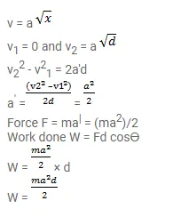 A particle of mass $m$ moves on a straight line with its velocity varying with the distance travelled according to the equation $v$ $=\mathrm{a} \sqrt{\mathrm{x}}$, where $\mathrm{a}$ is a constant. Find the total work done by all the forces during a displacement from $\mathrm{x}=0$ to $\mathrm{x}=\mathrm{d}$.