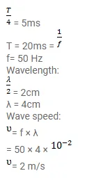 A particle on a stretched string supporting a travelling wave takes $5.0$ ms to move its mean position to the extreme position. The distance between two consecutive particles which are at their mean position is $2.0 \mathrm{~cm}$. Find the frequency, the wavelength and the wave speed.