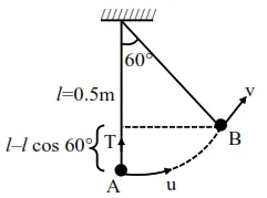 $-\mathrm{mgl}\left(1-\cos 60^{\circ}\right)=\frac{1}{2} \mathrm{mv}^{2}-\frac{1}{2} \mathrm{mu}^{2}$