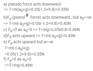 A pendulum bob of mass $50 \mathrm{~g}$ is suspended from the ceiling of an elevator. Find the tension in the string if the elevator (a) goes up with acceleration $1.2 \mathrm{~m} / \mathrm{s}^{2}$, (b) goes up with deceleration $1.2 \mathrm{~m} / \mathrm{s}^{2}$, (c) goes up with uniform velocity, (d) goes down with acceleration $1.2 \mathrm{~m} / \mathrm{s}^{2}$, (e) goes down with deceleration $1.2 \mathrm{~m} / \mathrm{s}^{2}$ and (f) goes down with uniform velocity.