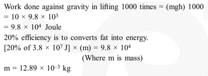 A person trying to lose weight by burning fat lifts a mass of $10 \mathrm{~kg}$ upto a height of $1 \mathrm{~m} 1000$ times. Assume that the potential energy lost each time he lowers the mass is dissipated. How much fat will he use up considering the work done only when the weight is lifted up? Fat supplies $3.8 \times 10^{7} \mathrm{~J}$ of energy per kg which is converted to mechanical energy with a $20 \%$ efficiency rate. Take $\mathrm{g}=9.8 \mathrm{~ms}{ }^{2}$ :-
