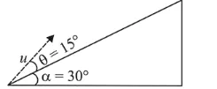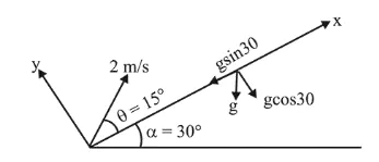 Distance, $\mathrm{S}=\left(2 \cos 15^{\circ}\right) T-\frac{1}{2} g \sin 30^{\circ}(T)^{2}$