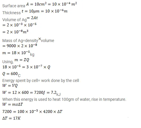 A plate of area $10 \mathrm{~cm}^{2}$ is to be electroplated with copper (density $9000 \mathrm{~kg} / \mathrm{m}^{3}$ ) to a thickness of 10 micrometers on both sides, using a cell of 12V. Calculate the energy spent by the cell in the process of deposition. If this energy is used to heat $100 \mathrm{~g}$ of water, calculate the rise in the temperature of the water. ECE of copper= $3 \times 10^{-7} \mathrm{~kg} / \mathrm{C}$ and specific heat capacity of water $=4200 \mathrm{~J} / \mathrm{kg}-\mathrm{K}$.