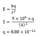 A point charge produces an electric an electric field of magnitude $5.0 \mathrm{~N} / \mathrm{C}$ at a distance of $40 \mathrm{~cm}$ from it. What is the magnitude of the charge?