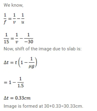 A point object is placed on the principal axis of a convex lens $(f=15 \mathrm{~cm})$ at a distance of $30 \mathrm{~cm}$ from it. A glass Plate $(\mu=1.50)$ of thickness $1 \mathrm{~cm}$ is placed on the other side of the lens perpendicular to the axis, Locate the image of the point object.