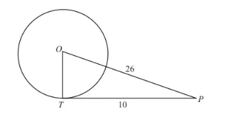 We have to find OT. From the properties of tangents we know that a tangent will always be at right angles to the radius of the circle at the point of contact. Therefore $\angle O T P$ is a right angle and triangle $O T P$ is a right triangle.