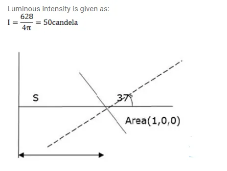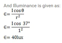 A point source emitting 628 lumen of luminous flux uniformly in all direction is placed at the origin. Calculate the illuminance on a small area placed at $(1.0 \mathrm{~m}, 0,0)$ in such a way that the normal to the area makes an angle of $37^{\circ}$ with the $X$-axis.