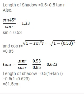 A pole of length $1 \mathrm{~m}$ stands half dipped in a swimming pool with water level $50.0 \mathrm{~cm}$ higher than the bed. The refractive index of water is $1.33$ and sunlight is coming at an angle of $45^{\circ}$ with the vertical. Find the length of the shadow of the pole on the bed.