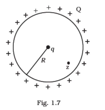 A positive charge Q is uniformly distributed along a circular ring of radius R. A small test charge q is placed at the centre of the ring (Fig. 1.7). Then