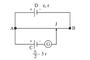 A potentiometer wire $A B$ having length $L$ and resistance $12 \mathrm{r}$ is joined to a cell $\mathrm{D}$ of emf $\varepsilon$ and internal resistance r. A cell C having emf $\varepsilon / 2$ and internal resistance $3 \mathrm{r}$ is connected. The length $\mathrm{AJ}$ at which the galvanometer as shown in fig. shows no deflection is: