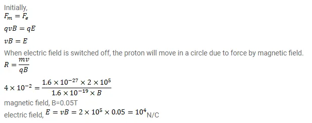 A proton goes undeflected in a crossed electric and magnetic field (the fields are perpendicular to each other) at a speed of $2.0 \times 10^{5} \mathrm{~m} / \mathrm{s}$. The velocity is perpendicular to both the fields. When the electric field is switched off, the proton moves along a circle of radius $4.0 \mathrm{~cm}$. Find the magnitudes of the electric and the magnetic fields. Take the mass of proton $=1.6 \times 10^{-27}$ $\mathrm{kg}$.