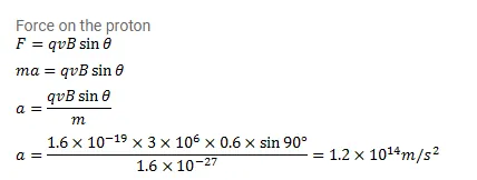 A proton is projected with a velocity of $3 \times 10^{6} \mathrm{~m} / \mathrm{s}$ perpendicular to a uniform magnetic field of $0.6 \mathrm{~T}$. find the acceleration of the proton.