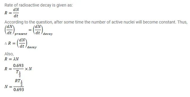 A radioactive isotope is being produced at a constant rate $\mathrm{dN} / \mathrm{dt}=\mathrm{R}$ in an experiment. The isotope has a half-life $\mathrm{t}_{1 / 2}$. Show that after a time $t>t_{1 / 2}$ the number of active nuclei will become constant. Find the value of this constant.