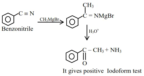 Question: A reaction of benzonitrile with one equivalent $\mathrm{CH}_{3} \mathrm{MgBr}$ followed by hydrolysis produces a yellow liquid "P". The compound "P" will give positive ___________.