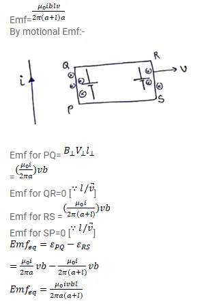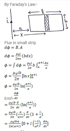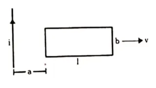 A rectangular metallic loop of length I and width b is placed coplanarly with a long wire carrying a current i. The loop is moved perpendicular to the wire with a speed $v$ in the plane containing the wire and the loop. Calculate the emf induced in the loop when the rear end of the loop is at the distance a from the wire. Solve by using faraday's law for the flux through the loop and also by replacing different segments with equivalent batteries.