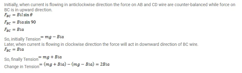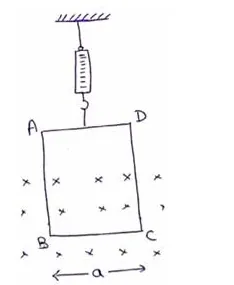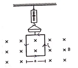 A rectangular wire-loop of width a is suspended from the insulted pan of a spring balance as shown in figure. A current i exists in the anticlockwise direction in the loop. A magnetic field B exists in the lower region. Find the change in the tension of the spring if the current in the loop is reversed.