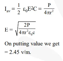 A red LED emits light at 0.1 watt uniformly around it. The amplitude of the electric field of the light at a distance of 1 m from the diode is :-