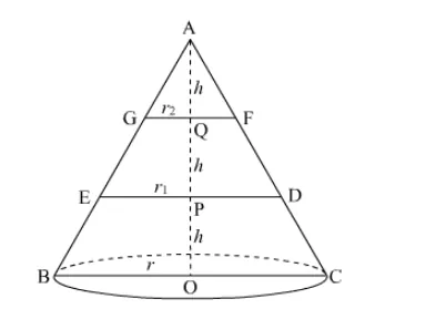 Let ABC be a right circular cone of height 3h and base radius r. This cone is cut by two planes such that AQ = QP = PO = h.