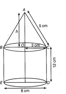 diameter and height of the cylinder are 6 cm and 12 cm, respectively. If the slant height of the conical portion is 5 cm, then find the total surface area
