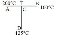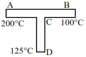 A rod CD of thermal resistance $10.0 \mathrm{KW}^{-1}$ is joined at the middle of an identical rod $A B$ as shown in figure, The end $A, B$ and $D$ are maintained at $200^{\circ} \mathrm{C}, 100^{\circ} \mathrm{C}$ and $125^{\circ} \mathrm{C}$ respectively. The heat current in CD is $\mathrm{P}$ watt. The value of $\mathrm{P}$ is .......