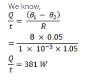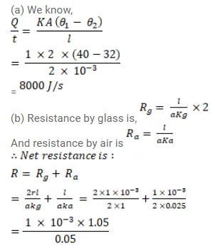 (b) The glass is now replaced by two glasspanes, each having a thickness of $1 \mathrm{~mm}$ and separated by a distance of $1 \mathrm{~mm}$. Calculate the rate of heat flow under the same conditions of temperature. Thermal conductivity of window glass $=1.0 \mathrm{~J} / \mathrm{m}-\mathrm{s}-{ }^{\circ} \mathrm{C}$ and that of air $=0.025 \mathrm{~J} / \mathrm{m}-\mathrm{s}-{ }^{\circ} \mathrm{C}$