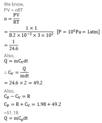 A sample of air weighing $1.18 \mathrm{~g}$ occupies $1.0 \times 10^{3} \mathrm{~cm}^{3}$ when kept at $300 \mathrm{k}$ and $1.0 \times 10^{5} \mathrm{~Pa}$. When $2.0$ cal of heat is added to it at constant volume, its temperature increase the temperature of air by $1^{\circ} \mathrm{C} t$ constant pressure, if the temperature of air by $1^{\circ} \mathrm{C}$ at constant pressure, if the mechanical equivalent of heat is $4.2 \times 10^{7} \mathrm{erg} / \mathrm{cal}$. Assume that air behave as an ideal gas.