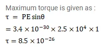 A sample of HCL gas is placed in an electric field of $2.5^{\times 10^{4}} \mathrm{~N} / \mathrm{C}$. The dipole moment if each HCL molecule is $3.4^{\times 10^{-30}}$ C$\mathrm{m}$. Find the maximum torque that can act on a molecule.
